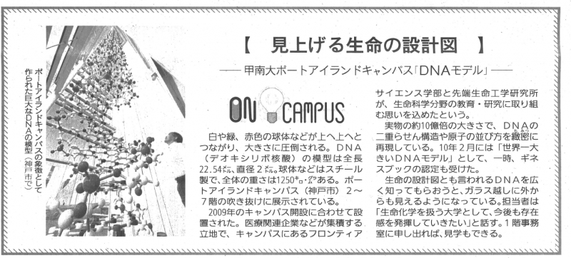 2024 年6月13日(金)、ポートアイランドキャンパスに設置されているDNAモデル模型について取材があり、6月28日(土)の読売新聞社夕刊「月刊大学」の記事として掲載されました。