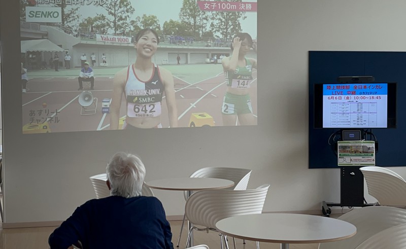 6月5日~8日、大学陸上競技の祭典、全日本インカレが開催されました。 「皆で応援しよう」ということで、6月5日~6日に、7階カフェテリアで競技の模様をライブ配信で放映しました。 競技時間になると学生が集まり、陸上部員の走りにドキドキ、ワクワク。 夕刻の決勝の時間には別のイベントがありましたが、生協のスタッフさんも学生と一緒に応援していました。