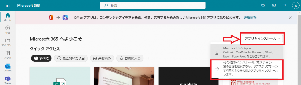 | インストールアプリ (2023年2月現在) | Word、Excel、PowerPoint、Microsoft Teams、Outlook、OneDrive、OneNote、Publisher(Windowsのみ)、Access(Windowsのみ) ※上記アプリが一括でダウンロードされます。アプリの個別指定はできません。 |